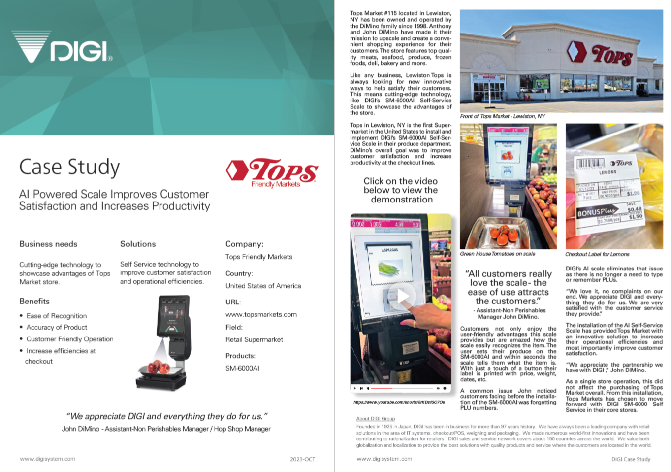 Tops in Lewiston, NY is the first Supermarket in the United States to install and implement DIGI’s SM-6000AI Self-Service Scale in their produce department. DiMino’s overall goal was to improve customer satisfaction and increase productivity at the checkout lines.