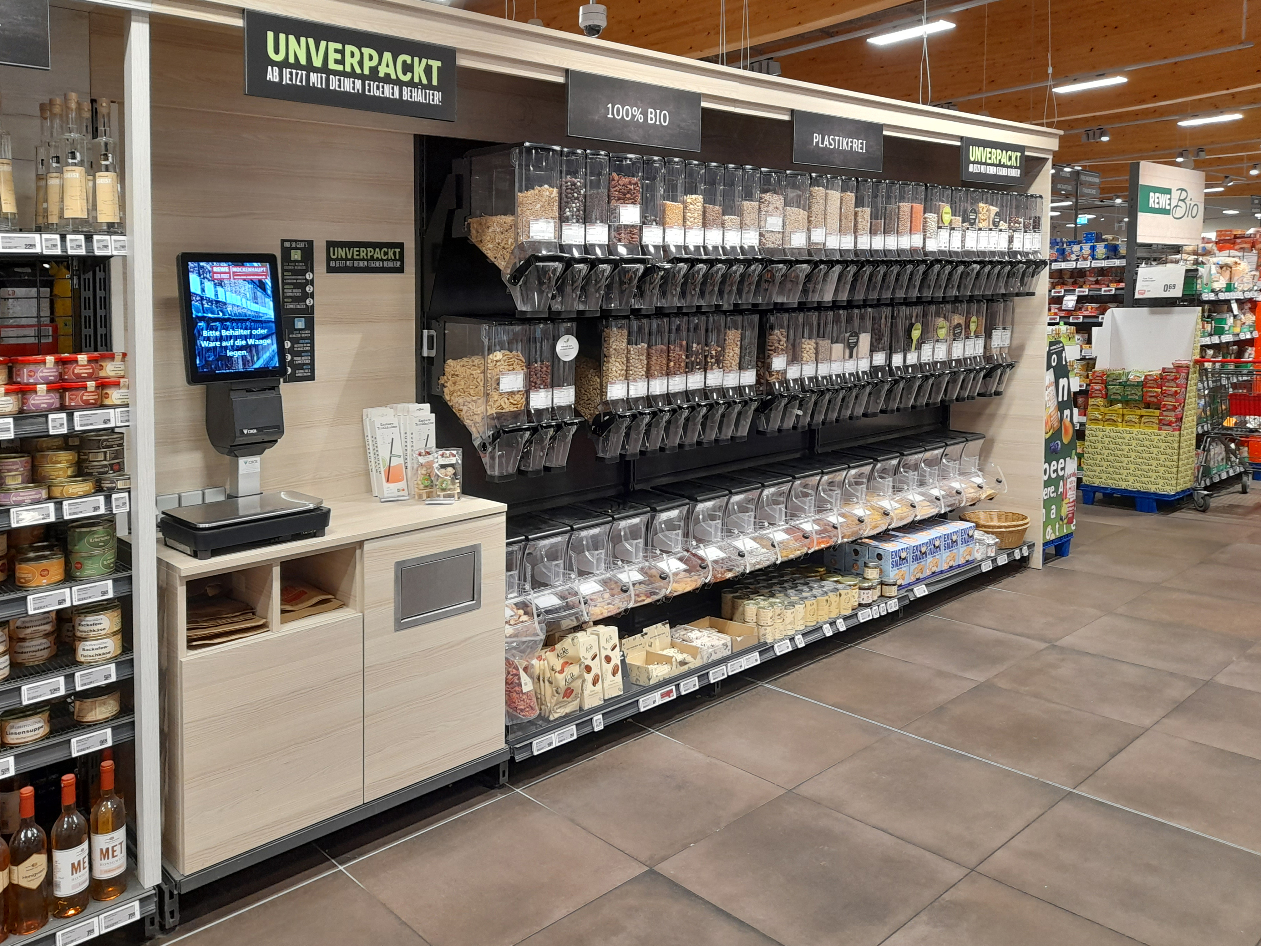 零售业In April 2022, the REWE Mockenhaupt store opened in Buchholz (Asbach, Neuwied), built to Green Building standards with a strong sustainability focus. A key feature is the unpackaged goods station, offering about 80 organic items in 60 gravity dispensers and 20 scoop bins, with equipment for using reusable containers.